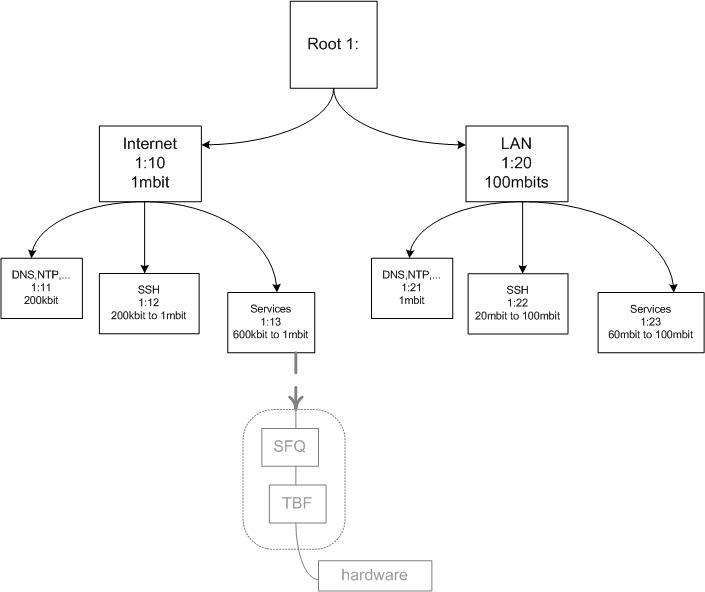 On this root, we will create two classes: one for Internet and one for the LAN. Each of these branches has a classid identifier (attached to the root) and a rate.