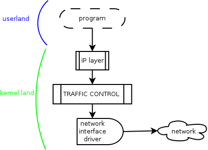 In the Internet world, everything is packets. Managing an network means managing packets: how they are generated, router, transmitted, reorder, fragmented, etc… Traffic Control works on packets leaving the system. It doesn't, initially, have as an objective to manipulate packets entering the system (although you could do that, if you really want to slow down the rate at which you receive packets). The Traffic Control code operates between the IP layer and the hardware driver that transmits data on the network. We are discussing a portion of code that works on the lower layers of the network stack of the kernel. In fact, the Traffic Control code is the very one in charge of constantly furnishing packets to send to the device driver.