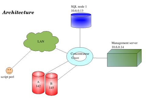 Le système d'exploitation utilisé est Ubuntu avec un noyau 2.6.15-27-386 et MySQL 5.0.24a. Le serveur de Management utilise le daemon NDB_MGMD, les nodes utilisent NDBD et les serveurs SQL utilisent le daemon MySQLD classique.